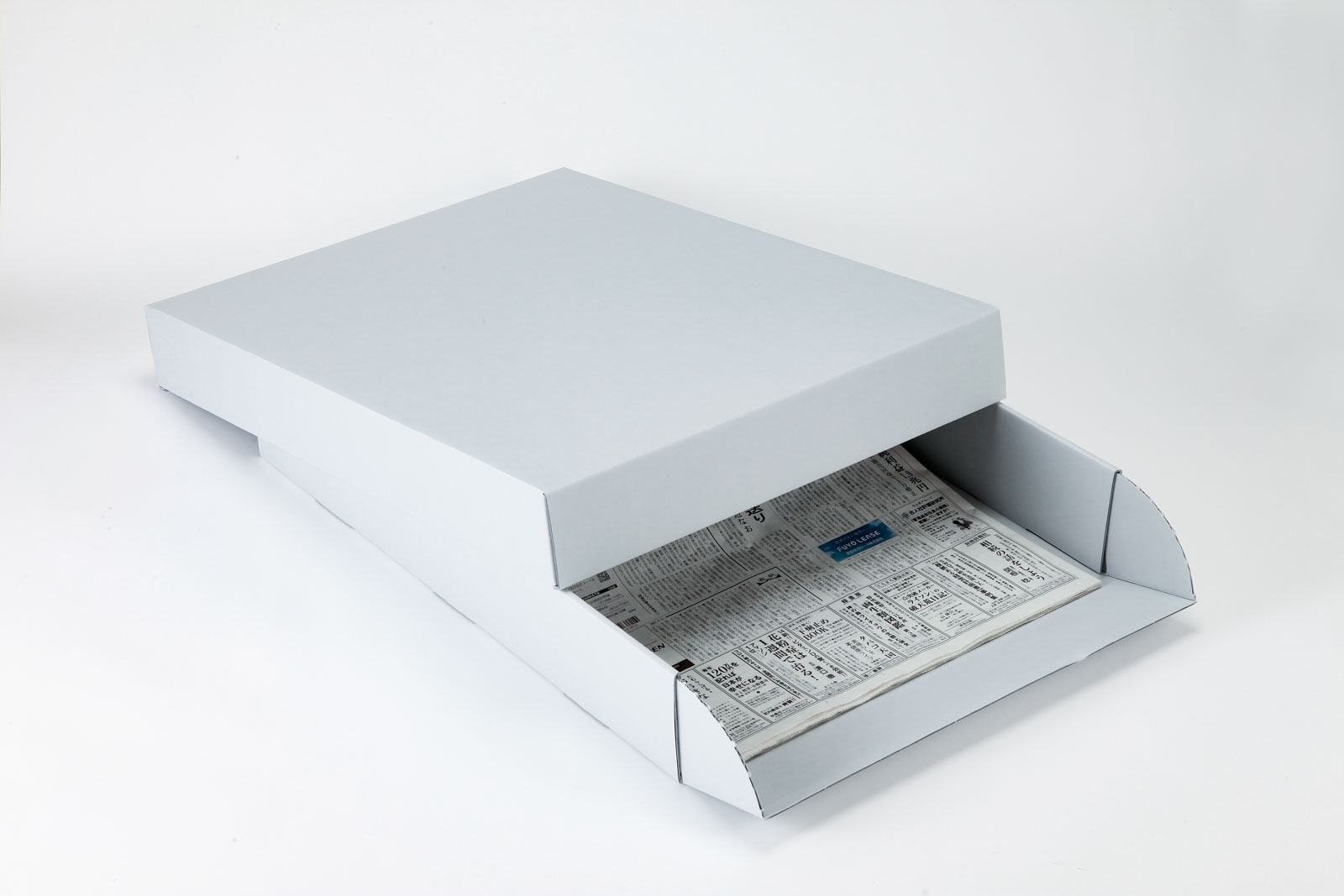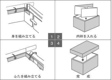 弱アルカリのダンボール(アーカイバルボード)を使用し、強度は一般の段ボール箱の2~3倍です。接着剤や留め具が不要な組み立て式。