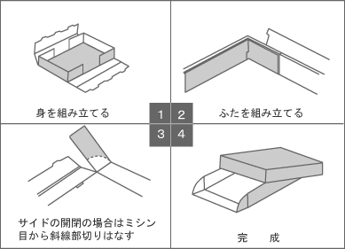 - シートのコルゲート(破線の接着部)が見えにくい方が表面で、箱の外側になります。